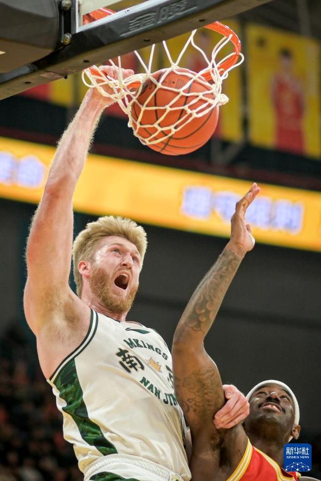 3月11日,南京天之藍(lán)隊球員馬內(nèi)克(左)在比賽中扣籃。新華社記者 江漢 攝