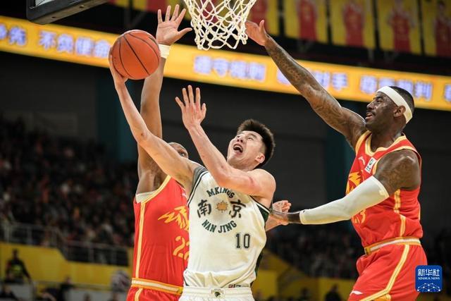 3月11日,南京天之藍(lán)隊球員郭昊文(中)在比賽中上籃。新華社記者 江漢 攝