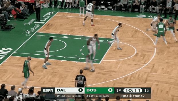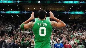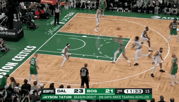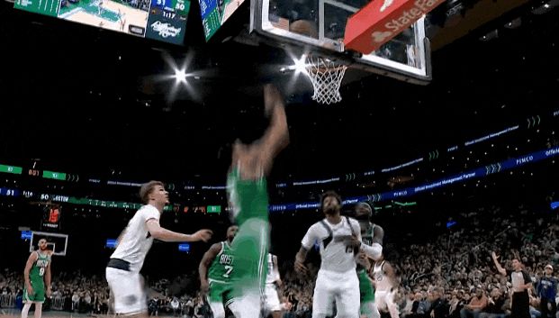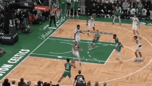 塔圖姆第三節(jié)開始,頂著防守突破打板了;低重心突破強(qiáng)拔中投了,左底角被鎖死后強(qiáng)拔三分了——前6投不中后是5連中。杰倫前6投1中后,11投8中。那一波浪潮,春風(fēng)又綠查爾斯河岸。