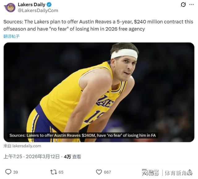 - 曝湖人計劃在今年夏天 為里夫斯提供一份5年2.4億美元的合同