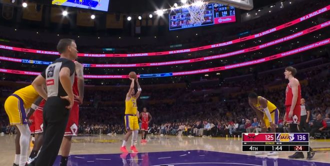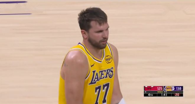 剩下1分44秒前,湖人再次被追到11分,然后東契奇造犯規(guī),在罰球線上得到了個(gè)人第51分。