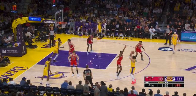 常規(guī)賽,湖人主場(chǎng)142-130戰(zhàn)勝公牛。