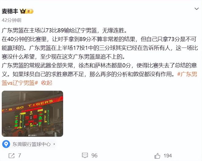 這樣的結(jié)果無疑讓廣東球迷非常不滿,第四節(jié)比賽還沒打完,現(xiàn)場就已經(jīng)有不少廣東球迷選擇提前離場,輸球不可怕,可怕的是輸?shù)貌幻鞑话祝屓丝床坏较M?。那么問題也來了,一番戰(zhàn)大勝遼寧30分的廣東隊(duì),為何卻在人員齊整的二番戰(zhàn)里吃下了一場主場73-89的16分慘敗呢?不妨來看看賽后各路籃球媒體人的看法。