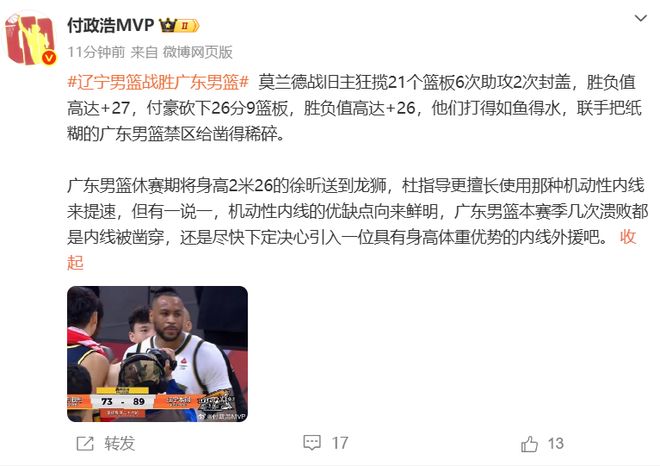 付政浩也針對廣東內(nèi)線的孱弱發(fā)表了看法,把輸球的部分原因歸結(jié)于徐昕的離隊(duì):莫蘭德戰(zhàn)舊主狂攬21個籃板6次助攻2次封蓋,勝負(fù)值高達(dá)+27,付豪砍下26分9籃板,勝負(fù)值高達(dá)+26,他們打得如魚得水,聯(lián)手把紙糊的廣東男籃禁區(qū)給鑿得稀碎。廣東男籃休賽期將身高2米26的徐昕送到龍獅,杜指導(dǎo)更擅長使用那種機(jī)動性內(nèi)線來提速,但有一說一,機(jī)動性內(nèi)線的優(yōu)缺點(diǎn)向來鮮明,廣東男籃本賽季幾次潰敗都是內(nèi)線被鑿穿,還是盡快下定決心引入一位具有身高體重優(yōu)勢的內(nèi)線外援吧。