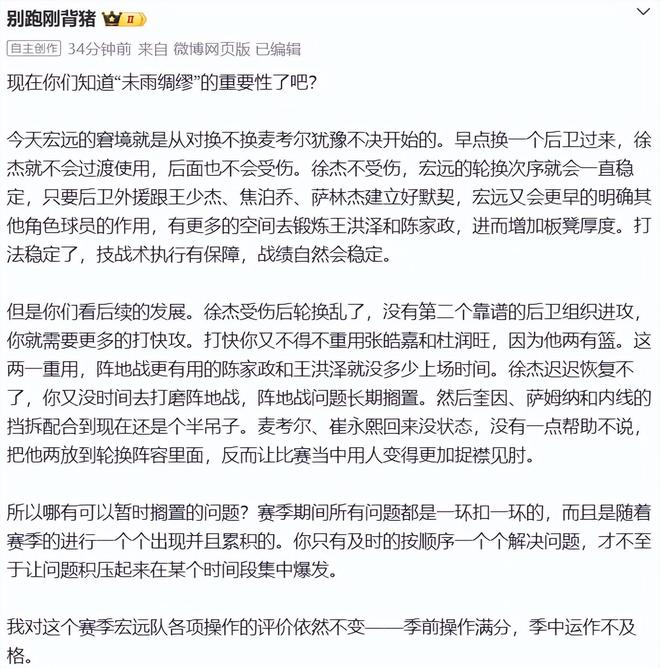 別跑剛背豬則把矛頭指向了麥考爾:今天宏遠(yuǎn)的窘境就是從對換不換麥考爾猶豫不決開始的。早點(diǎn)換一個后衛(wèi)過來,徐杰就不會過度使用,后面也不會受傷。徐杰不受傷,宏遠(yuǎn)的輪換次序就會一直穩(wěn)定,只要后衛(wèi)外援跟王少杰、焦泊喬、薩林杰建立好默契,宏遠(yuǎn)又會更早的明確其他角色球員的作用,有更多的空間去鍛煉王洪澤和陳家政,進(jìn)而增加板凳厚度。打法穩(wěn)定了,技戰(zhàn)術(shù)執(zhí)行有保障,戰(zhàn)績自然會穩(wěn)定。