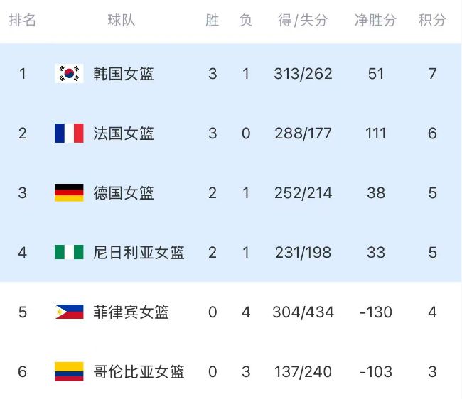 隨著韓國(guó)隊(duì)31分大勝,中國(guó)女籃10分小勝,世預(yù)賽最新積分形勢(shì)也已經(jīng)出爐。