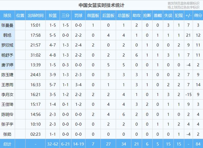 球員數(shù)據(jù)統(tǒng)計,王思雨14分1板3助、韓旭12分4板1助、楊舒予11分2板6助、羅欣棫11分2板、李月汝9分4板1助、陳玉婕9分3板3助、陳明伶4分6板2助、張子宇4分2板、王佳琦3分4板3助2斷、張曼曼3分1板2助、唐子婷2分5板、張茹2分