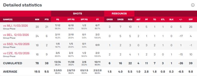 實則,李月汝除首場世預賽12中7高效得到21+10后,隨后三場依次是:11中2得到6+5+2,6中1得到2+3,5中3得到9+4。李月汝后三場世預賽表現(xiàn)不佳,場均只有5.7分4籃板1助攻,外加場均送出2次失誤與2次犯規(guī),投籃命中率低至22中6只有27.2%,三分命中率同樣低至4中1僅有25.0%。