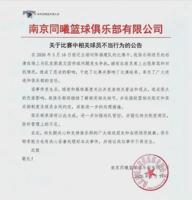 - 2名球員比賽過程中起爭(zhēng)執(zhí) 南京同曦籃球俱樂部致歉