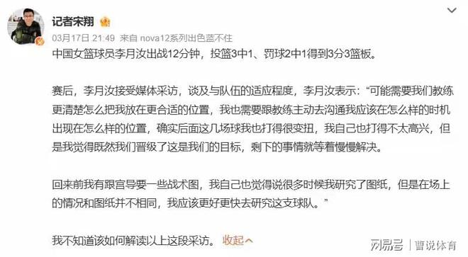 情況不妙!李月汝直言:教練不理解,我打得不太高興,宮魯鳴被質(zhì)疑!萬(wàn)眾矚目的女籃世預(yù)賽小組賽已經(jīng)打完,看了直播的球迷都知道,中國(guó)女籃小組賽5場(chǎng)比賽打完,拿到了四勝一負(fù)的成績(jī),以小組第二名的成績(jī)晉級(jí)到女籃世界杯的16強(qiáng)。僅從拿到的成績(jī)來(lái)看,不得不說(shuō)中國(guó)女籃,本次世預(yù)賽小組賽賽表現(xiàn)還是非常不錯(cuò)的,但是看了直播的球迷都知道,中國(guó)女籃本次世預(yù)賽小組賽打的其實(shí)并沒(méi)有那么好。