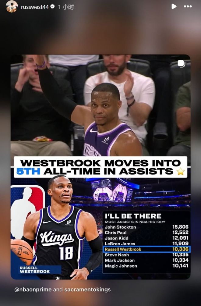 - 威少助攻數(shù)升歷史第五 連超兩位歷史名宿