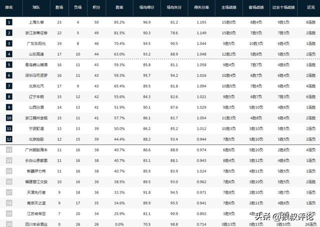 數(shù)據(jù)方面,上海男籃場(chǎng)均得到96.3分聯(lián)盟第一,場(chǎng)均失分80.6分聯(lián)盟第一,場(chǎng)均44.5籃板聯(lián)盟第一,場(chǎng)均22.8個(gè)助攻聯(lián)盟第一。