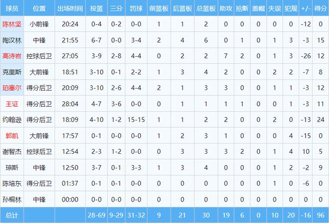 本場(chǎng)比賽,無(wú)論在外援還是國(guó)內(nèi)球員的對(duì)比上,山東隊(duì)均處于劣勢(shì)。約翰遜得到山東隊(duì)最高分24分,但10投只有4中,有15分來(lái)自罰球。陶漢林發(fā)揮出老將作用,得到15分6籃板。珀塞爾10中3,得到12分。高詩(shī)巖9中3,得到12分,正負(fù)值低至負(fù)26。王證三分球6中3,得到11分,且正負(fù)值只有負(fù)3,成為山東隊(duì)為數(shù)不多的亮點(diǎn)之一。值得一提的是,山東隊(duì)全隊(duì)96分鐘,有三成(31分)來(lái)自罰球,進(jìn)攻流暢性可見(jiàn)一斑。