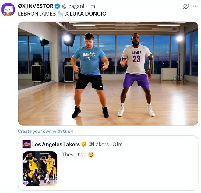 美媒轉(zhuǎn)推湖人盛贊東契奇X詹姆斯后寫道:詹姆斯/東契奇已是雙山羊。