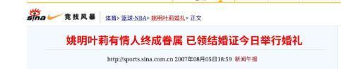 參考資料:《新聞午報》2007年8月7日刊發(fā)報道《姚明葉莉有情人終成眷屬 已領結(jié)婚證今日舉行婚禮》