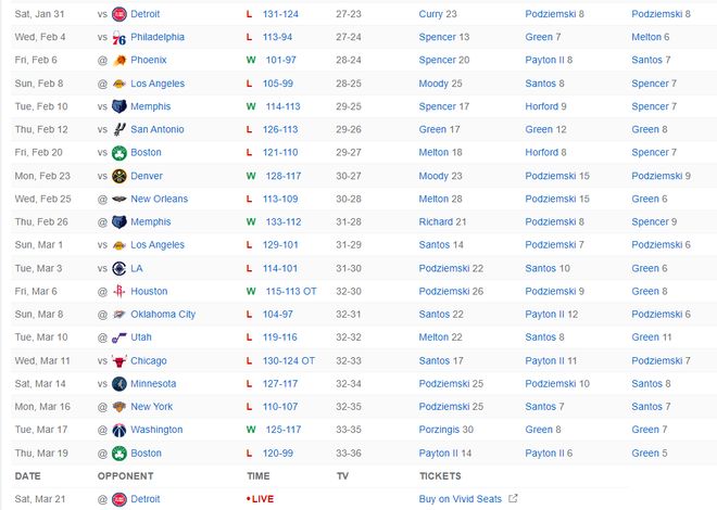 自1月31日以來勇士隊的21場比賽他們只贏了6場比賽,庫里缺席的20場比賽輸?shù)袅?4場比賽,雖然庫里的訓(xùn)練師兼籃球表現(xiàn)教練布蘭登-佩恩聲稱庫里本賽季肯定會回歸,可目前庫里依舊沒有確定的復(fù)出時間表。