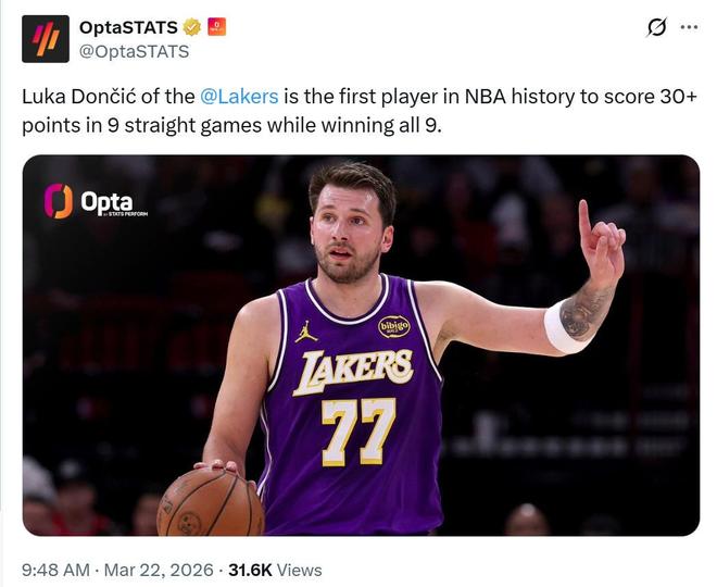 他已經(jīng)連續(xù)9場砍下30+得分并帶隊拿下全部勝利,也讓東契奇成為NBA成立至今80年歷史長河中首位做到這一壯舉的球員,可謂是數(shù)據(jù)戰(zhàn)績一把抓。