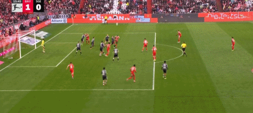 第16分鐘,帕夫洛維奇抽射,桑托斯撲救失誤,拜仁1-0法蘭克福