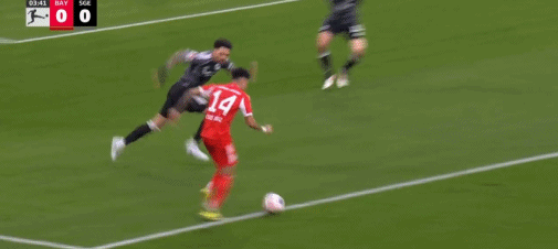 第41分鐘,斯塔尼希奇?zhèn)髦?,穆西亞拉鏟射沒有碰到球