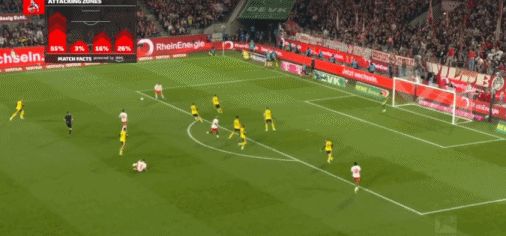 第17分鐘,拜爾頭球送助攻,吉拉西鏟射破門,多特1-0科隆