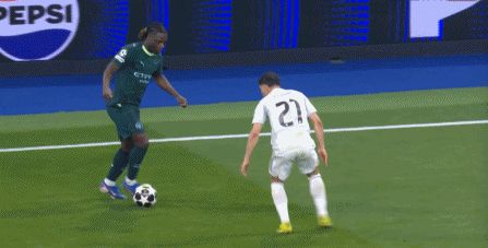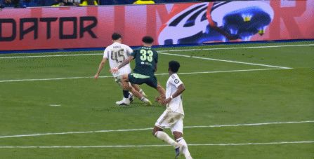 這是一個最大的危險信號,因為如果格伊開始撐不住了,那曼城的后場就沒人能撐住了,于是到了第42分鐘,皇馬再次從左邊路完成提速,打出反擊,維尼修斯將球帶到了前場: