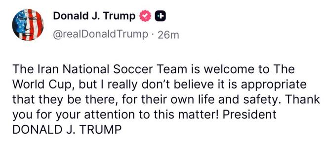 首先引爆輿論的是,美國(guó)總統(tǒng)特朗普的一番爭(zhēng)議言論。他在個(gè)人社交媒體上,公開談到伊朗隊(duì)參加世界杯的問(wèn)題。他表示:“歡迎伊朗隊(duì)參加世界杯,但出于對(duì)他們自身生命安全的考慮,我真的認(rèn)為他們不適合出現(xiàn)在世界杯?!?/p>
