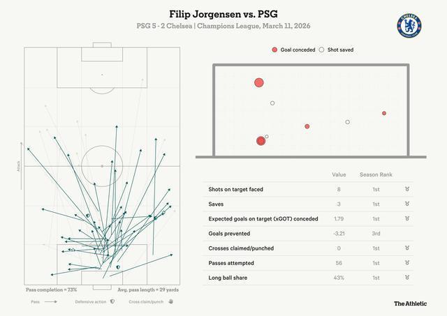在這場(chǎng)激動(dòng)人心的歐冠鏖戰(zhàn)的前73分鐘里,有無數(shù)個(gè)瞬間,約恩森,以及切爾西,都在自己的防守三區(qū)里玩火。隨著巴黎不知疲倦地奔跑以切斷傳球角度和縮小防守距離,他們從后場(chǎng)組織進(jìn)攻的勇氣在令人欽佩和愚蠢魯莽之間瞬息切換。
