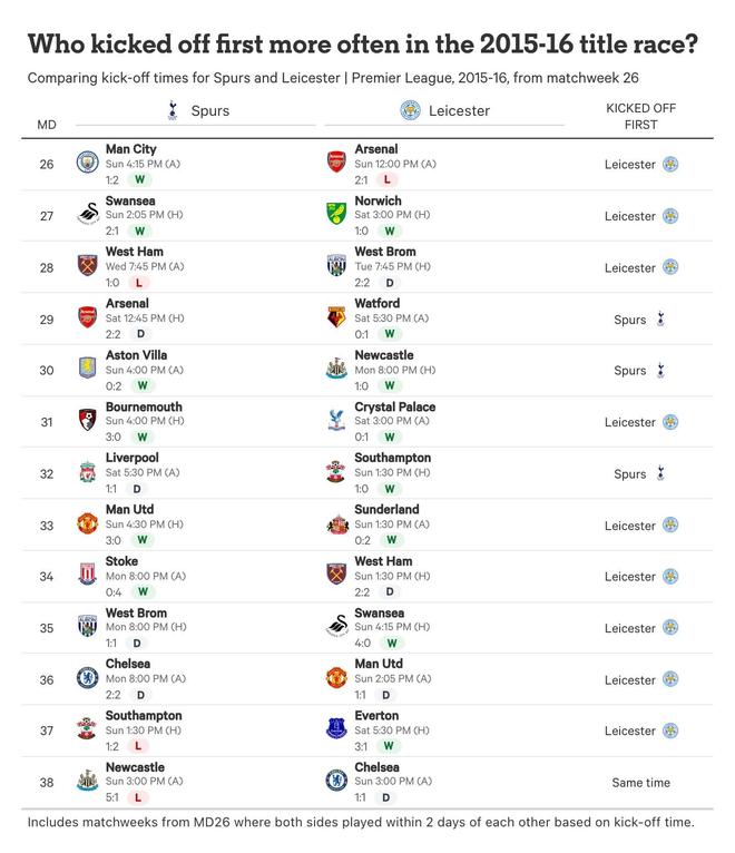 數據支持了他們的懷疑。在那個賽季最后13輪比賽中——就本文而言,這是“冠軍沖刺階段”的界定——萊斯特城有9次先賽,相比之下熱刺只有3次,而最后一輪,像往常一樣,所有10場頂級聯賽同時開球。對熱刺來說,這包括連續(xù)三場周一比賽,最后一場以一場火藥味十足的2-2客場戰(zhàn)平切爾西告終,這個結果將冠軍拱手送給了克勞迪奧-拉涅利、杰米-瓦爾迪和他的隊友們。