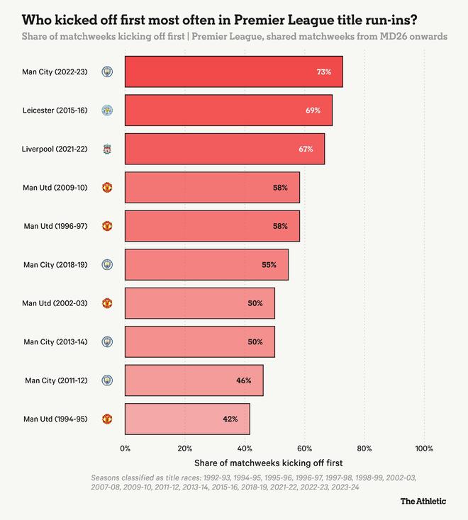 在所有冠軍沖刺階段中,萊斯特城那年在69%的比賽中先賽,這是自1992年英超時代開始以來的第二高比例。