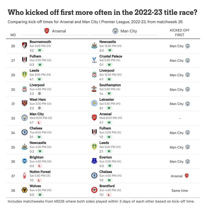 近日,The Athletic發(fā)表專題文章,談到了英超冠軍爭奪戰(zhàn)進入最后階段后的賽程爭議,重點探討了潛在冠軍球隊的開賽順序對比賽結果的影響,收集了球員、名宿的觀點并結合過往賽季數據進行分析,表示先開賽帶來的所謂優(yōu)勢在數據層面并不顯著,真正決定冠軍歸屬的仍是球隊實力、戰(zhàn)術部署與心理素質,而非賽程安排的細微差異,以下為專題文章。