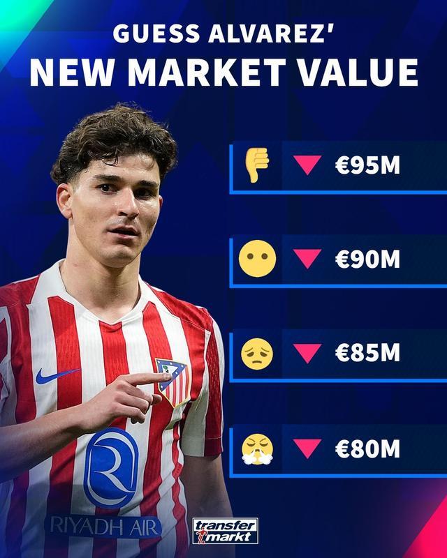 在此之前,德轉(zhuǎn)官方預(yù)熱阿爾瓦雷斯身價(jià)下跌,并列出了幾個(gè)可能的身價(jià),分別是9500萬歐、9000萬歐、8500萬歐和8000萬歐。