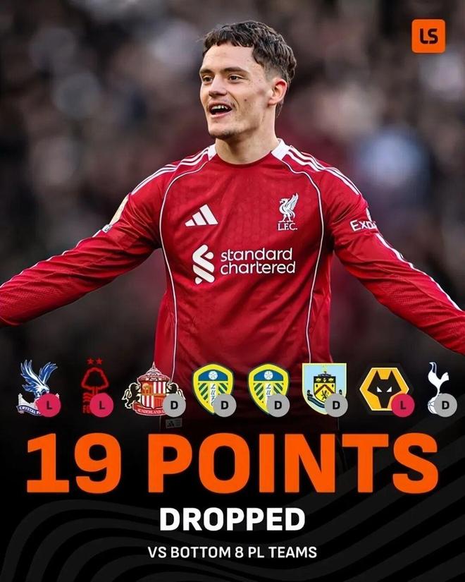 根據(jù)數(shù)據(jù)機(jī)構(gòu)記錄,本賽季利物浦對英超聯(lián)賽后八名球隊丟了19分。這個成績跟他們昔日的斗志、不服輸?shù)谋荣愄厣孟喾?。?jù)悉,斯洛特輸給過水晶宮、諾丁漢森林和狼隊,戰(zhàn)平過桑德蘭、利茲聯(lián)(2次)、伯恩利和熱刺的,的確是送分太多。