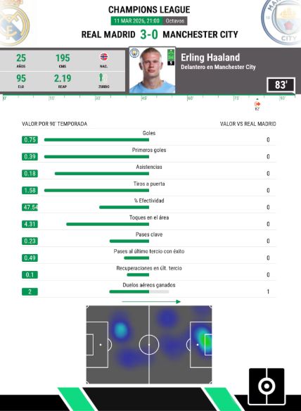 歐冠對陣皇馬就是最好的證明:全場只有4次射門,作為終結(jié)者的哈蘭德竟然零貢獻(xiàn)。