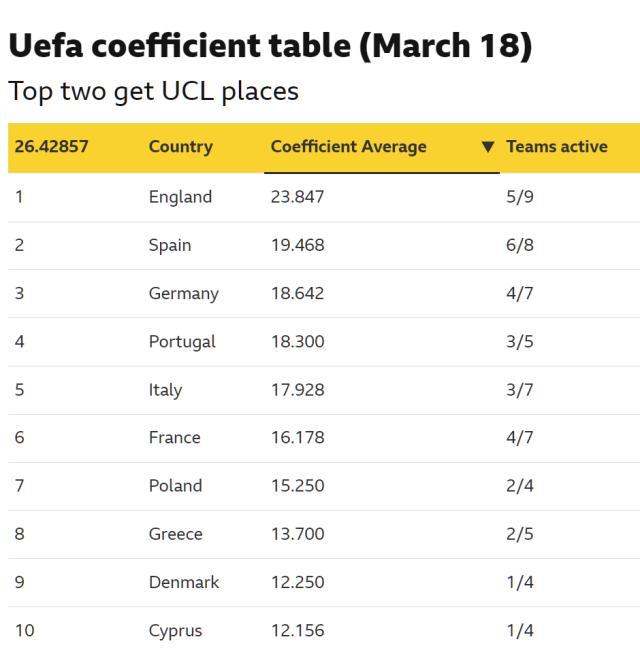 聯(lián)賽階段紅紅火火6隊(duì)全部存活,到1/8決賽慘案不斷4隊(duì)出局,英超諸強(qiáng)在今年歐冠的大起又大落不能不說(shuō)是個(gè)很熱鬧的話題。而這究竟是虛假繁榮還是時(shí)運(yùn)不佳,這里就不做細(xì)致的討論,只講一個(gè)很現(xiàn)實(shí)的問(wèn)題:在遭遇一番“血洗”之后,英超下賽季還能獲得那張額外的歐冠門票嗎?也就是英超究竟“前四踢歐冠還是前五踢歐冠”。正式答案目前還不能公布,但基本可以確定的是,英超繼續(xù)拿到5個(gè)名額問(wèn)題不大。