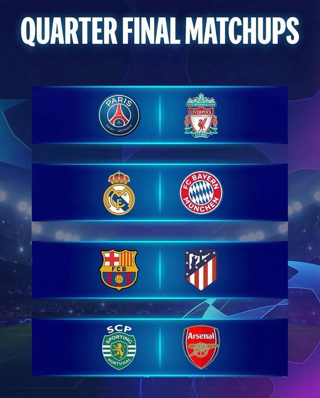 - 歐冠8強(qiáng)出爐,對(duì)陣情況公布:皇馬碰拜仁,巴黎大戰(zhàn)利物浦