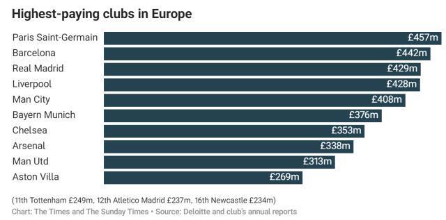 英超整體經(jīng)濟(jì)體量舉世第一,轉(zhuǎn)會(huì)總開銷也往往抵上其他四大聯(lián)賽之和,這都是事實(shí)。但必須指出,在最頂尖豪門的領(lǐng)域,英超不僅競(jìng)技實(shí)力對(duì)比“皇薩仁黎”往往處于下風(fēng),就比錢,英超豪門經(jīng)常也是相對(duì)“貧窮”的那個(gè)。