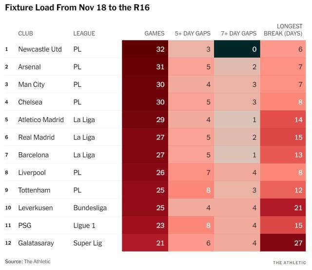 英超球隊(duì)沒有冬休,比賽數(shù)量更多,是事實(shí)。競(jìng)技網(wǎng)一周前的數(shù)據(jù)顯示,本季五大聯(lián)賽,比賽數(shù)量前4名,被紐卡斯?fàn)柭?lián)、阿森納、曼城、切爾西這4支英超球隊(duì)包攬。本周一組新數(shù)據(jù),則揭示了從11月國(guó)際比賽周到歐冠16強(qiáng)之間的更鮮明對(duì)比。上述英超4隊(duì)最多打了32場(chǎng)比賽,皇薩則只有27場(chǎng)。