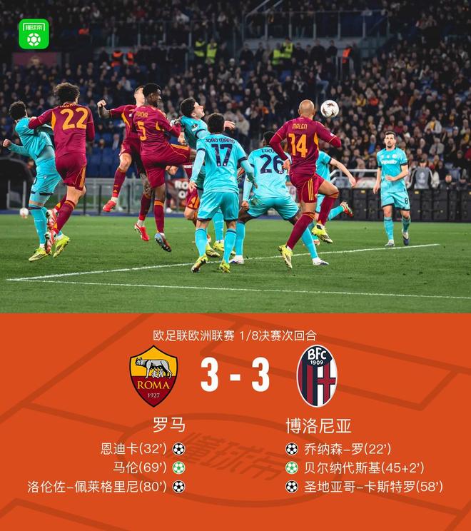 北京時間3月20日歐足聯(lián)歐洲聯(lián)賽 1/8決賽次回合,羅馬對陣博洛尼亞。羅馬恩迪卡破門,洛倫佐-佩萊格里尼破門,馬倫破門。博洛尼亞喬納森-羅破門,圣地亞哥-卡斯特羅破門,貝爾納代斯基破門。最終比分羅馬 3-3 博洛尼亞。兩回合總比分羅馬4-4博洛尼亞。