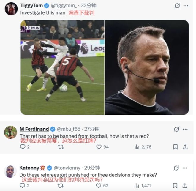 曼聯(lián)球迷則在英超官方賬號(hào)下面留言,表示裁判應(yīng)該被禁賽,要求徹查裁判。