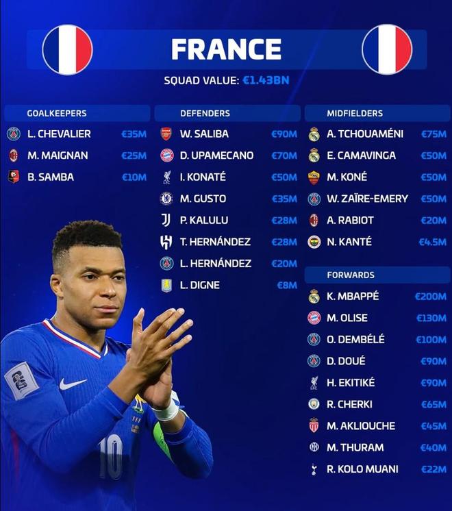 - 新一期法國隊(duì)身價(jià)榜:姆巴佩、奧利塞前2,26人總身價(jià)14.3億