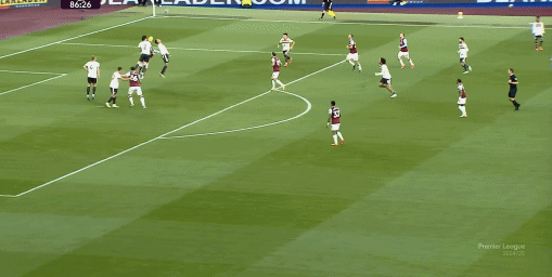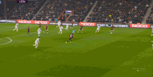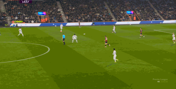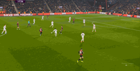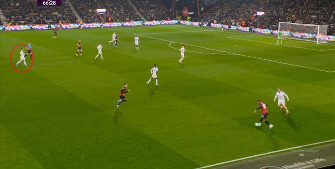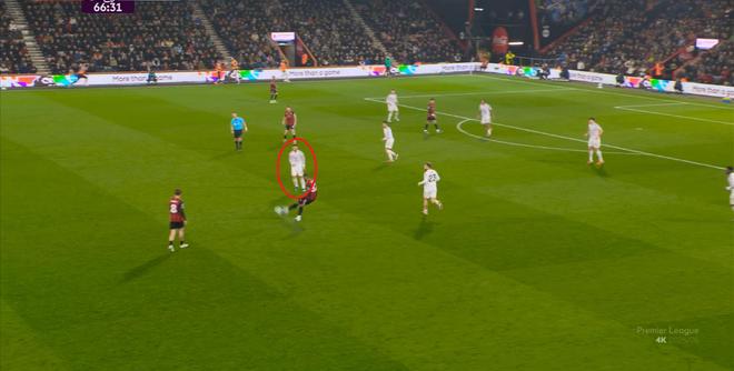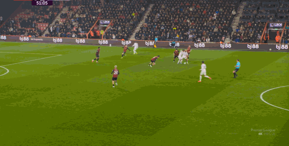 如果布魯諾一直保持拉揚(yáng)接球時(shí)的站位,他是可以堵住橫移線路,從而降低伯恩茅斯進(jìn)攻效率的: