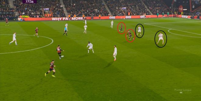 但伯恩茅斯頂住之后,打出反擊,便抓到了曼聯(lián)的中場(chǎng)空虛,直接形成了三打三: