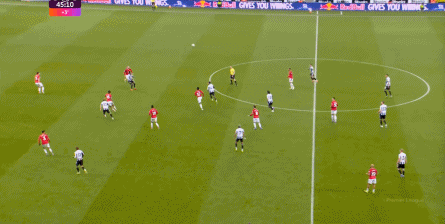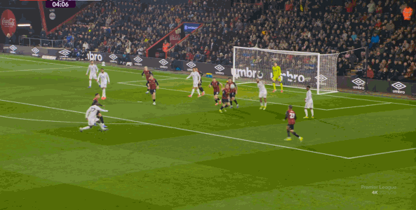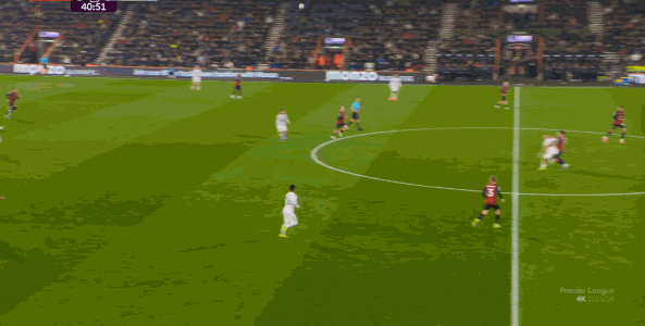 于是在這次轉(zhuǎn)換中,伯恩茅斯擊穿曼聯(lián)的中路,隨后從左路送上傳中: