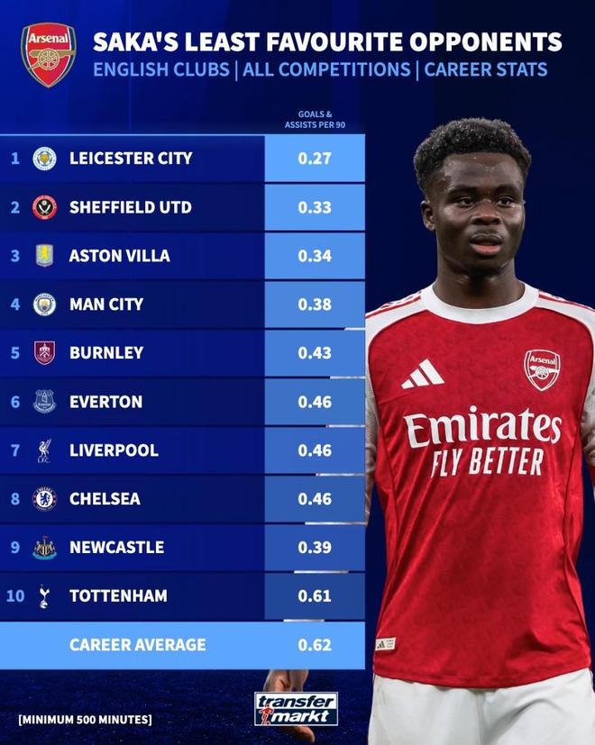 - 薩卡14次對(duì)陣曼城只造4球,生涯英格蘭范圍內(nèi)所有對(duì)手第四低